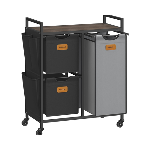 Cesto lavanderia con 3 scomparti, 26.4 Gal. (100 L) smistatore bucato, carrello della biancheria rotolante con ripiani, piccole tasche laterali