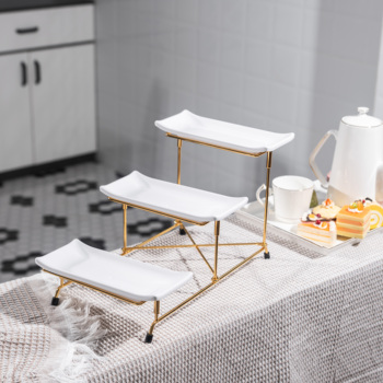 3 עמדת הגשה עם פלטות פורצלן לבן, סטנד תצוגת מזון מסתובבת 14.5 "X6" עם מגשי מתכת מזהב
